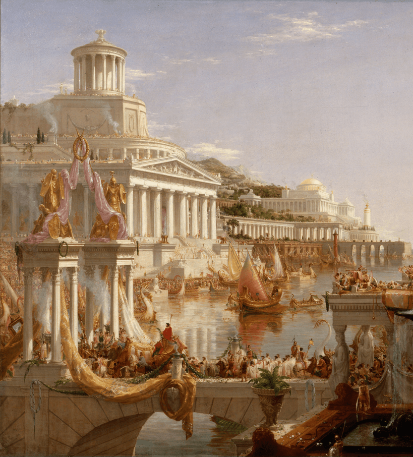 Paintings by N.C. Wyeth, Thomas Cole, Walter Crane, and He Dazi.